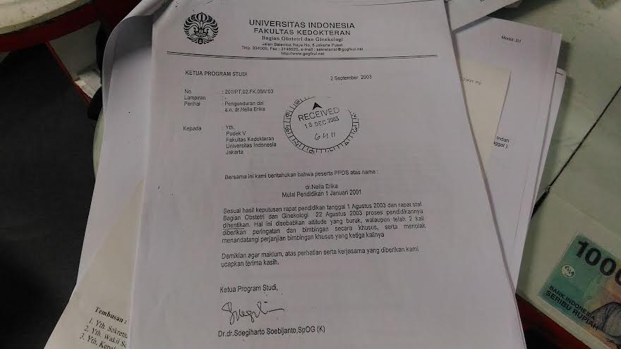 Kasus pemalsuan surat yang dimaksud adalah surat yang ditandatangani Ketua Program Studi, Dr. dr. Soegiharto Soebijanto, SPpOG (K) bernomor 201/PT.02.FK.09/I/'03 bertanggal 2 September 2003 kepada Pudek V FKUI. Perihalnya pengunduran diri dr. Nella. Di sisi lain, surat dimaksud adalah pemberhentian pendidikan dengan merujuk hasil keputusan Rapat Pendidikan tanggal 1 Agutus 2003 dan Rapat Staf Bagian Obstetri dan Ginekologi tanggal 22 Agustus 2003.