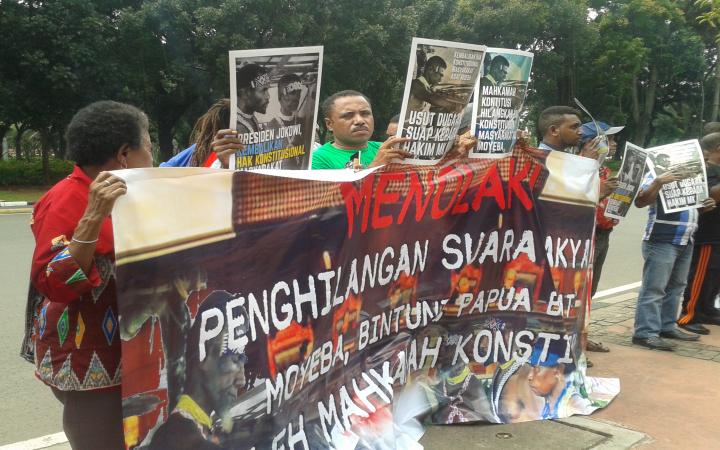 "Bahkan, saat KPU meminta dilakukan PSU atau Pemungutan Suara Ulang di di TPS 1 Moyeba, Distrik Moskona Utara, kemenangan pasangan kami Daniel Asmorom dan Yohanis Manibuy tetap telak. Namun kok sampai di Jakarta sini malah dikalahkan. Ini tipu-tipu. Dorang (MK) sudah mengkhianati kami. Suara kami, hak konstitusional kami dianggap tidak ada,†papar Ketua Lembaga Masyarakat Adat Distrik Moskona Utara, Kabupaten Teluk Bintuni, Papua Barat Evert Orgenes Orocomna.