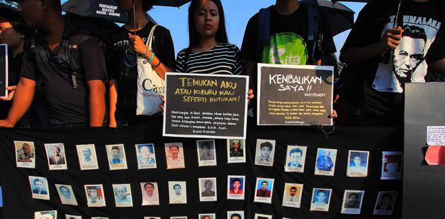Aktivis yang tergabung dalam Jaringan So!idaritas Korban untuk Keadilan (JSKK) melakukan aksi Diam Kamisan ke-455 sekaligus memperingati HUT RI ke-71 di depan Istana Merdeka, Jakarta, Kamis (18/8). JSKK menuntut Presiden memegang teguh komitmen untuk menyelesaikan pelanggaran HAM berat masa lalu dan menghapus impunitas sebagaimana tercantum dalam Nawacita. Dwi Pambudo/Rakyat Merdeka