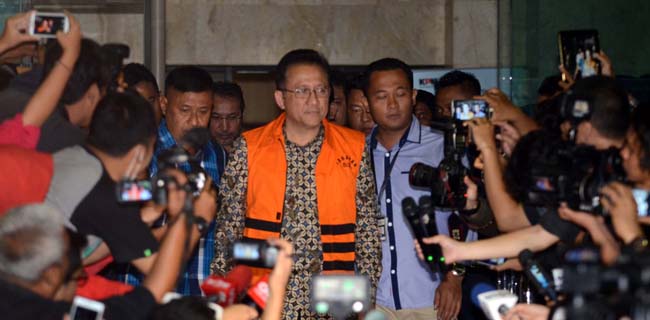 Ketua DPD Irman Gusman resmi Memakai Baju Tahanan usai di periksa KPK Jakarta, Sabtu (17/9). Ketua DPD terbukti menerima suap sebesarRp100 juta terkait kebijakan kuota gula impor. Putu Wahyu Rama/RM