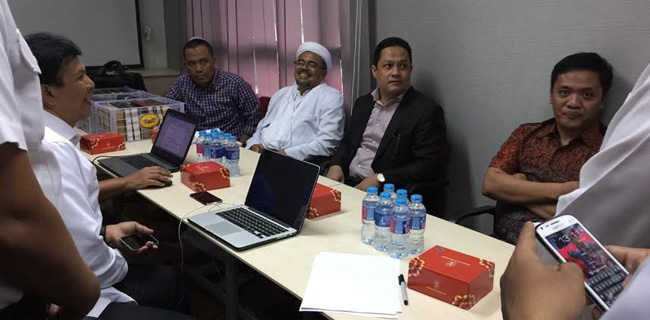 Imam Besar Front Pembela Islam atau FPI, Habib Rizieq Syihab (berjubah dan bersorban putih), tampak tertawa saat menjalani pemeriksaan di kantor Bareskrim Polri, di Jakarta, pada Kamis (3/11). Sedangkan Kepala Bareskrim Polri, Komjen Pol Ari Dono Sukmanto, berbaju putih di sebelah kiri, juga tampak tertawa. Rizieq diperiksa sebagai ahli agama dalam perkara dugaan penistaan agama yang menjerat Gubernur DKI Jakarta non aktif, Basuki Purnama atau biasa disapa Ahok. Repro