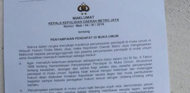 Maklumat ini saya buat tadi malam (kemarin malam), dan akan disebar secara paralel. Rencananya kami juga akan sebarkan melalui udara,†ujarnya saat konferensi pers di Polda Metro Jaya, kemarin.