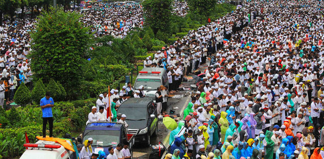 Ribuan umat Islam melaksanakan shalat Jumat di tengah guyuran hujanan saat Aksi Bela Islam III di kawasan Sarinah, Jalan MH Thamrin, Jakarta Pusat, Jumat (2/12). Aksi ini menuntut tersangka kasus penistaan agama Basuki T. Purnama ditahan. Dwi Pambudo/RMOL