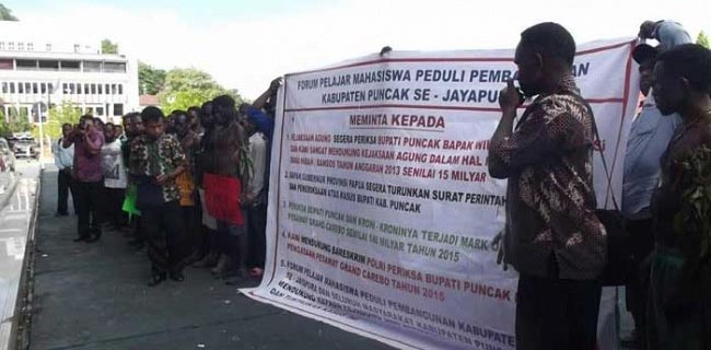 Kedatangan mereka, mendesak agar segera diusut tuntas penyelewengan dan penggelapan Dana Bantuan Sosial (Bansos) Kabupaten Puncak Papua sebesar Rp 15 miliar oleh Bupati Puncak Papua Willem Wandik beserta pihak-pihak terkait yang terlibat.