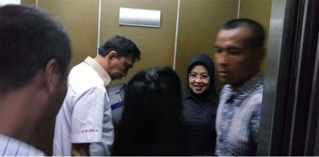 Saat keluar dari lift, Sylviana Murni tampak tersenyum. Dia kemudian memberikan keterangan kepada pers.