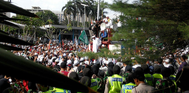 "Siap laporkan Megawati ke polda. Nanti pulang dari sini laporkan Megawati ke polda masing-masing terkait penistaan agama," kata Rizieq disambut riuh massa.