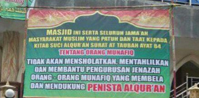 Salah satu spanduk yang dianggap meresahkan terdapat di Jalan Karet Karya, Karet, Setiabudi, Jakarta Selatan. Isi spanduk adalah penolakan dan larangan menyalatkan jenazah pendukung calon gubernur Jakarta penista agama di musala dan masjid setempat.