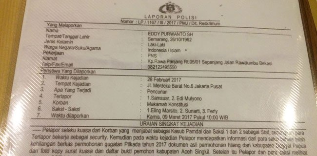 Sebagaimana diberitakan sebelumnya, dari laporan kepolisian, diungkapkan telah terjadi kehilangan berkas permohonan gugatan Pilkada di Kabupaten Dogiyai, Papua. Berkas tersebut juga termasuk fotokopi surat kuasa dan daftar bukti pemohon Kabupaten Aceh Singkil.