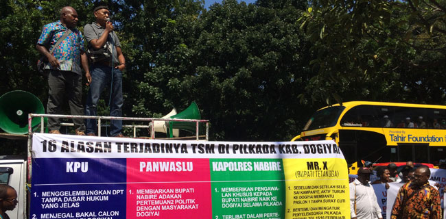 "Saya menuntut keadilan, karena di Dogiyai kami sudah di curangi oleh KPU, sudah dicurangi oleh Panwas, sudah dicurangi oleh Kapolres Nabire dan Bupati Nabire. Dan kami tidak mau di curangi di MK. Karena MK adalah tempat menyelesaikan permasalahan pilkada terakhir." tegas calon Bupati Dogiyai, Markus Waine kepada pada wartawan di sela-sela aksi, Jumat (24/3)