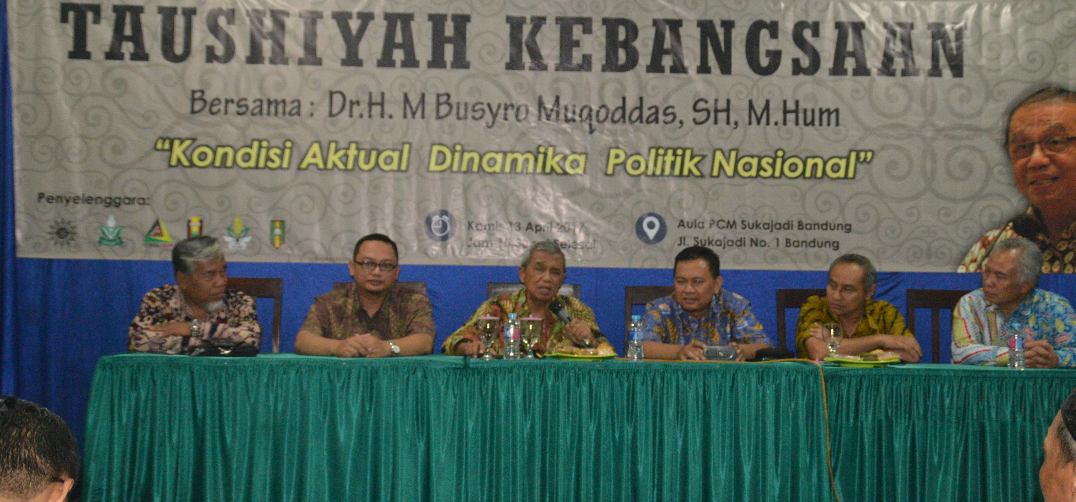 "Analisis situasi sosial lingkungan sekitar, baik ranting, cabang, daerah dan wilayah masing-masing. Sebagai contoh Kota Bandung ini, jangan sampai di daerah hijau itu berdiri pohon beton, gedung dan perumahan. Jika itu terjadi, itu kezaliman tata ruang, bisa menjadi indikasi adanya permainan kotor. Korbanya masyarakat, hujan kecil aja terjadi banjir besar," kata Busyro.