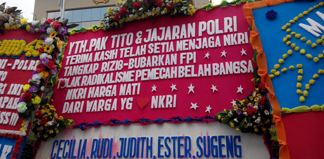 "YTH. PAK TITO DAN JAJARAN POLRI. TERIMAKASIH TELAH SETIA MENJAGA NKRI. TANGKAP Riziq DAN BUBARKAN FPI," bunyi pesan dalam karangan bunga berlatar merah muda itu.