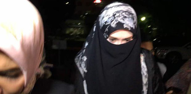 Mengenakan kerudung plus cadar, Firza hanya bisa menunduk menghindari sorot kamera saat menuju kendaraan yang menjemputnya.