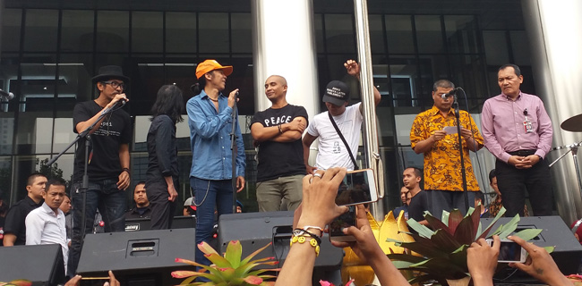 "Dari gunjang ganjing hak angket KPK ini, kita menganggap KPK itu 'hope'. Suatu bangsa kalau mimpinya dihilangkan, bisa bubar. Hari ini kita datang supaya meyakinkan teman-teman KPK, harapan ini jangan hilang," ujar Bimbim, drummer Slank usai konser di lobby Gedung KPK, Jakarta.