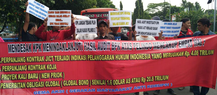 Karena itu massa dari Gerakan Masyarakat Anti Korupsi (Gema Aksi) menuntut KPK untuk segera memberikan kepastian hukum terhadap RJ Lino yang ditetapkan sebagai tersangka pada 18 Desember 2015 lalu.