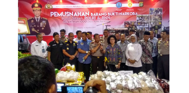 Mabes Polri bersama Badan Narkotika Nasional memusnahkan barang bukti narkoba berbagai jenis hasil pengungkapan selama Januari-Juli 2017.