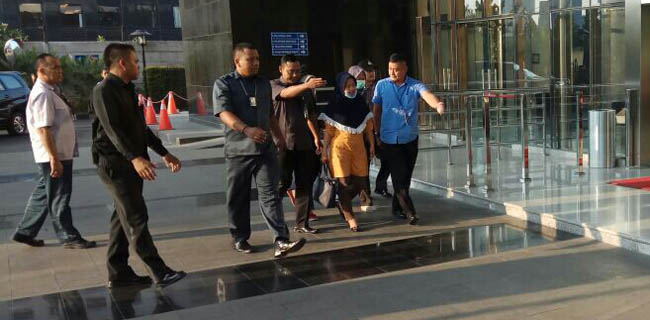 Mobil yang membawa Hakim Dewi sampai lebih dulu di Gedung KPK pukul 16.42 WIB. Ia mengenakan baju kuning dan jilbab hitam sambil menjinjing sebuah tas. Nampak masket biru menempel didagunya.