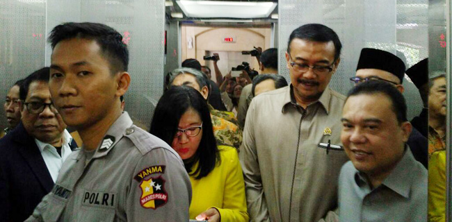 Rombongan MKD yang berjumlah sekitar lima orang di antaranya Sufmi Dasco Ahmad dan Maman Imanulhaq PKB tiba dengan menumpang bus Sekretariat Jendral DPR.