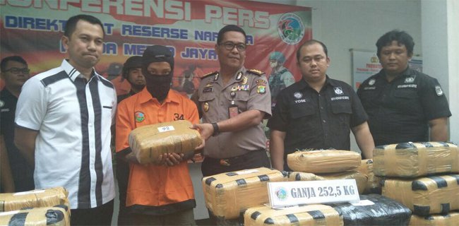 Aparat Direktorat Lalu Lintas Polda Metro Jaya berhasil mengamankan kendaraan pick up bermuatan ganja seberat 252,5 kg yang diselundupkan dalam keranjang jeruk di Jalan Gatot Subroto, Jakarta, Senin (25/9) malam.
