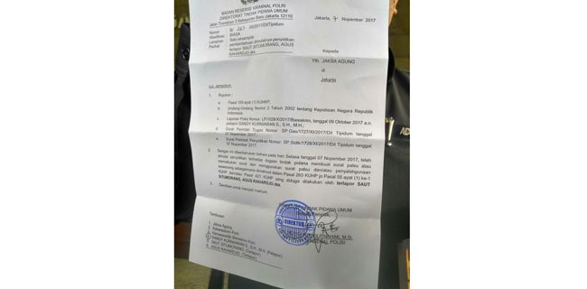 “Soal benar atau tidaknya, pertimbangan penyidik di uji nanti oleh Jaksa kan begitu. Jaksa nanti diuji lagi oleh hakim, jadi saya kira ini soal pertaruhan profesional, jadi menurut saya, ya ga usah dibawa ke lain-lain, SPDP ini akan saling menguji sendiri nantinya,†tandasnya.