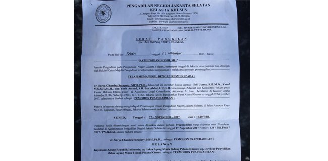 Lebih lanjut Edi menjelaskan, pengaukan gugatan praperadilan telah didaftarkan pada 17 November lalu dengan nomor 134/Pid.Prap/2017/PN.Jkt.Sel