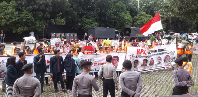 Sejumlah wajah pun terpampang dalam sebuah banner yang dibentangkan di halaman kantor Agus Rahardjo Cs itu. Diantaranya wajah Menteri hukum dan hak asasi manusia Yasonna H Laoly, Gubernur Jawa Tengah Ganjar Pranowo, Melchias Mekeng, Marzuki Ali yang disebut-sebut menerima pembagian dana proyek KTP-el. Korupsi yang dilakukan bersama-sama tersebut menyebabkan kerugian negara sebesar Rp 2,3 triliun.