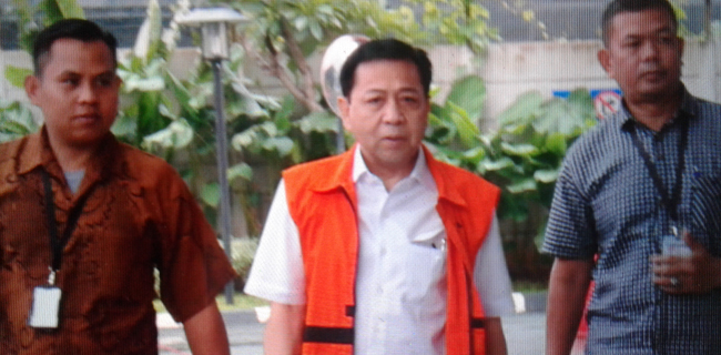 Setnov datang pukul 09.00 WIB dengan mengenakan kemeja putih dan celana hitam seperti biasanya, tak lupa rompi oranye melengkapi busananya.