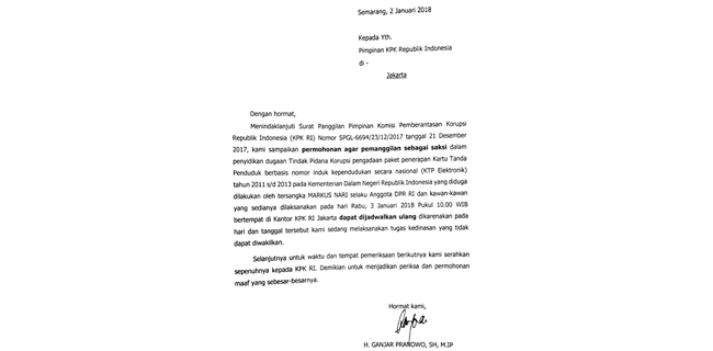 "Sedianya dilaksanakan (pemeriksaan) pada hari Rabu 3 Januari 2018 pukul 10.00 WIB bertempat di Kantor KPK RI Jakarta dapat dijadwalkan ulang, karena pada hari dan tanggal tersebut kami sedang melaksanakan tugas kedinasan yang tidak dapat diwakilkan," kata Ganjar melalui surat resminya yang ditujukan kepada pimpinan KPK.