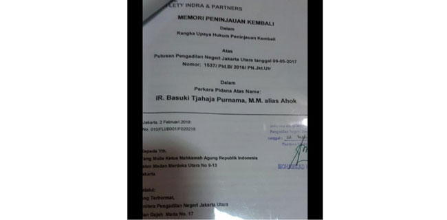 "Memori Peninjauan Kembali Dalam Rangka Upaya Hukum Peninjauan Kembali Dalam Rangka Peninjauan Kembali Atas Putusan Pengadilan Jakarta Utara tanggal 09-05-2017 Nomor: 1537/Pi.B/2016/PN.Jkt.Utr. Dalam Rangka Perkara Pidana Atas Nama IR. Basuki Tjahaja Purnama, M.M. alias Ahok," demikian tertulis dalam dokumen tersebut.