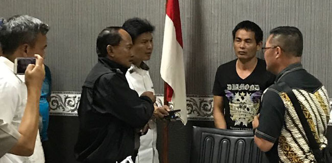 Ari Dono didampingiKepala Tim penyidik Satgassus Polri, AKBP Donny Alexander saat menginterogasi tersangka di Mapolda Kepulauan Riau, Rabu (21/2).