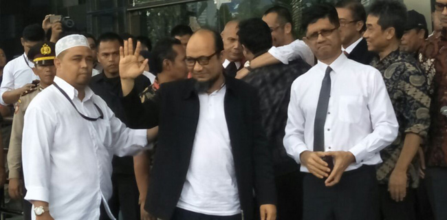 Novel sampai di lobi kantor KPK dengan mengenakan kaos putih dibalut jaket berwarna hitam. Ia berjalan melewati pegawai KPK dan simpatisannya sembari melambaikan tangan.
