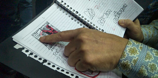 Setnov lantas menunjukkan foto dan hasil tulisan tangan Farrel yang disimpannya di dalam sebuah buku bersampul hitam. Dalam bukunya Setnov, terdapat tulisan Novanto yang dibalik menjadi Otvanov.