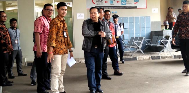 Penampilan Novanto agak berbeda kali ini. Ia terlihat kasual dengan kaos warna hitam dibalut jaket, celana denim biru dan sepatu kets.