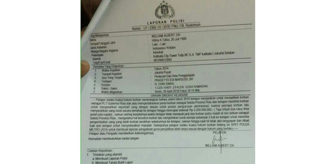 "Namun seiring berjalannya waktu terlapor tidak menempati janji dan korban justru malah dinonjobkan sebagai Sekda Provinsi Riau," demikian uraian singkat dalam LP yang ditandatangani Brigadir Vrista Nurvita selaku yang menerima laporan.