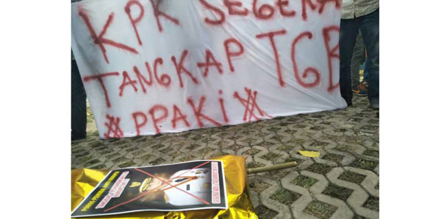 Dalam aksinya mereka membentangkan spanduk bertuliskan "KPK Segera Tangkap TGB", dan sejumlah poster dengan foto TGB lengkap tulisan "Tangkap & Penjarakan TGB Koruptor!!!", "Segera Adili TGB Koruptor NTB!!!"