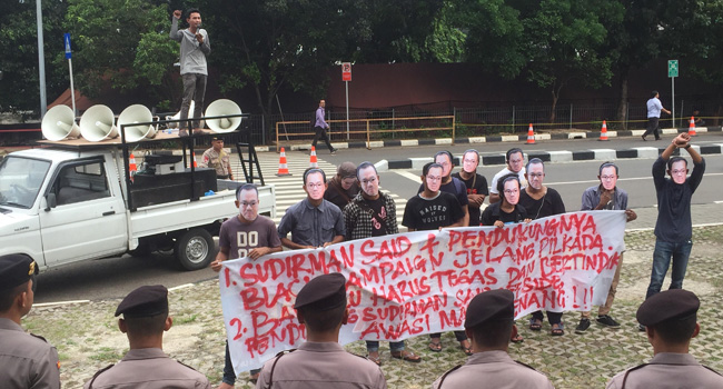 Sejumlah massa yang datang mengenakan topeng bergambar wajah Sudirman Said juga mendesak agar Sudirman segera dipanggil.