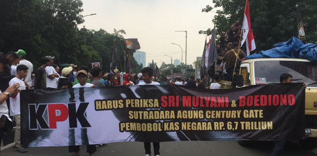 Massa aksi yang mengikuti unjuk rasa membawa banner dan gambar Menteri Keuangan Sri Mulyani dan mantan Wakil Presiden Boediono. Mereka menuntut KPK segera memanggil dan memeriksa keduanya karena dituding sebagai dalang skandal Century.
