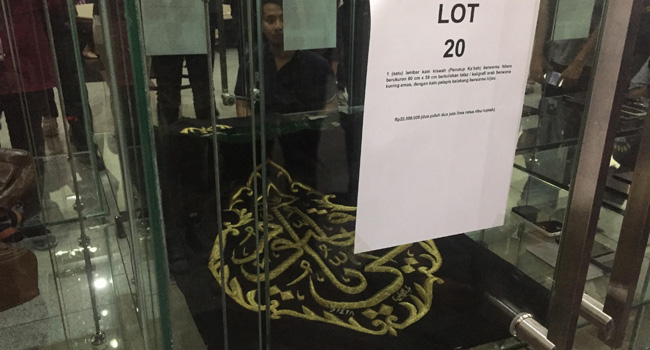 Kain hitam berukuran 80 cm x 59 cm itu terjual ke tangan pengusaha besi tua asal Madura, HR. Muhammad Jufri Saad.