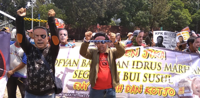 Ratusan orang yang tergabung dalam elemen bernama FRAKSI (Front Rakyat Anti korupsi) menggelar aksi di Gedung KPK, Senin (20/8).