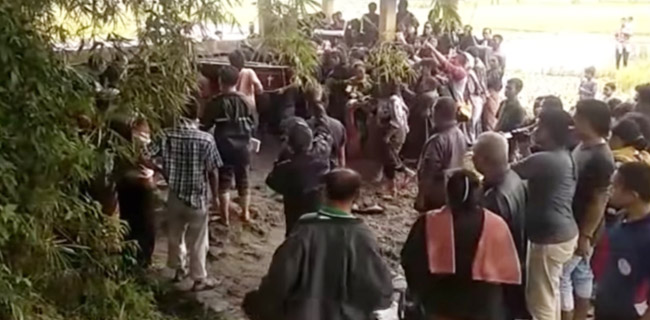 Tangis haru pecah saat empat peti jenazah Gaban Nainggolan sekeluarga ditutup. Satu per satu jenazah lantas diturunkan untuk dimasukkan ke dalam satu liang lahat di tengah persawahan.