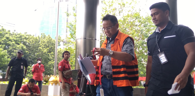 Tahan Panggabean yang merupakan satu tersangka dalam kasus penerimaan suap dari mantan Gubernur Sumut, Gatot Puji Nugroho tiba di gedung KPK pukul 10.34 WIB dengan mengenakan rompi oranye.