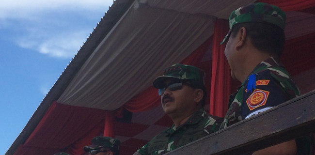Panglima TNI Marsekal TNI Hadi Tjahjanto secara seksama menyaksikan jalannya Latihan Bantuan Tembakan Terpadu TNI 2018 di Pusat Latihan Tempur Marinir Asembagus, Situbondo, Jawa Timur, Rabu (28/11).