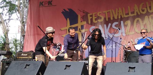 Wakil Ketua KPK, Saut Situmorang (tengah) membuka final Festival Lagu Suara Anti Korupsi (Saksi) 2018 di Plaza Festival, Kuningan, Jakarta, Jumat (30/11). Saut yang didaulat sebagai juri menabuh gendang bersama dua juri lainnya yaitu musisi band Navicula, Gede Robi dan musisi band Cupu Manik, Che tanda dimulainya final. Ahmad Kiflan Wakik/RMOL