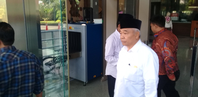 Kiai Asep baru saja tiba di gedung KPK. Dia mengenakan peci hitam, baju putih dan sarungan.