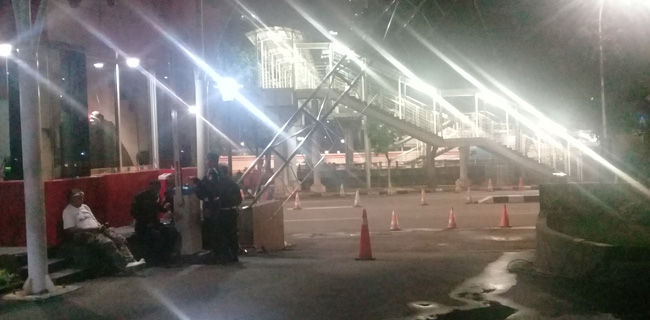 Kantor Berita Politik RMOL di lokasi sekira pukul 22.00 WIB, tampak para petugas keamanan masih berjaga-jaga seperti menanti tamu yang tak biasanya.