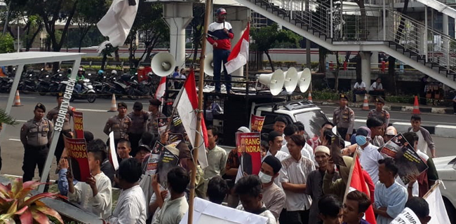 Massa aksi di Gedung Merah Putih, KPK, Kuningan, Jakarta Selatan, Senin (8/4), meminta KPK netral, jangan ikut-ikutan bermain politik.