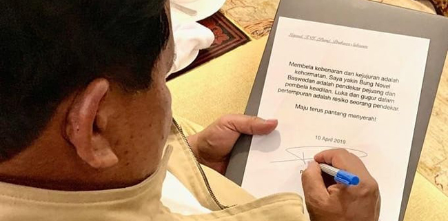 Dalam pesan itu, Prabowo menyebut Novel Baswedan sebagai seorang pendekar karena memperjuangkan kebenaran dan kejujuran.