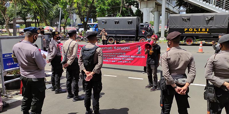 Kantor Berita Politik RMOL, sejumlah orang ini menggelar aksi dengan membawa sebuah spanduk yang meminta agar KPK memeriksa dan menangkap Dominggus dalam kasus yang menjerat Wahyu Setiawan.