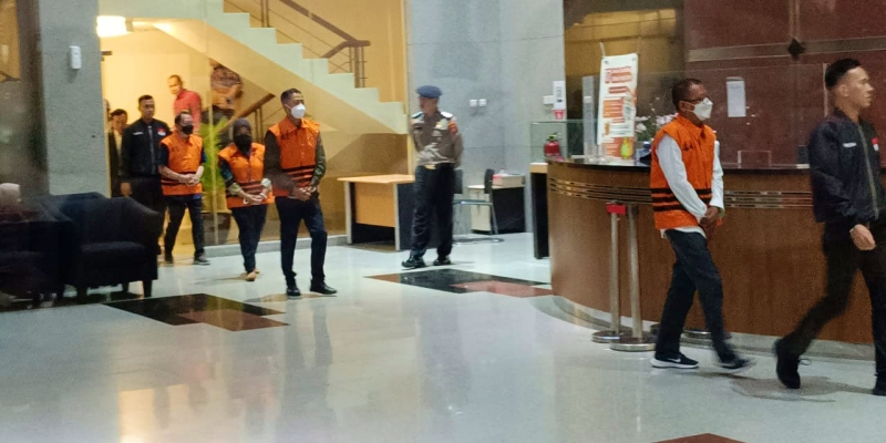 RMOL, usai menjalani pemeriksaan selama 8,5 jam sejak pukul 10.00 WIB hingga pukul 18.25 WIB di Gedung Merah Putih KPK, Jalan Kuningan Persada Kav 4, Setiabudi, Jakarta Selatan, empat orang tersangka resmi mengenakan rompi oranye tahanan saat turun dari ruang pemeriksaan di lantai dua.