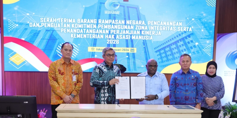 Prosesi penandatanganan Berita Acara Serah Terima (BAST) turut disaksikan oleh Wakil Menteri HAM Mugiyanto, Direktur Layanan Barang Bukti dan Pengelolaan Benda Sitaan (Labuksi) KPK Mungki Hadipratikto, serta Sekretaris Jenderal Kementerian HAM Novita Ilmaris.