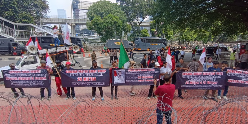 Selanjutnya spanduk bertuliskan "Tuntaskan Kasus CSR BI Indikasi Melibatkan DPR Komisi XI 2019-2024 Khususnya Tiga dari Lampung Salah Satunya Ela Nuryamah saat ini sebagai Bupati Lampung Timur".